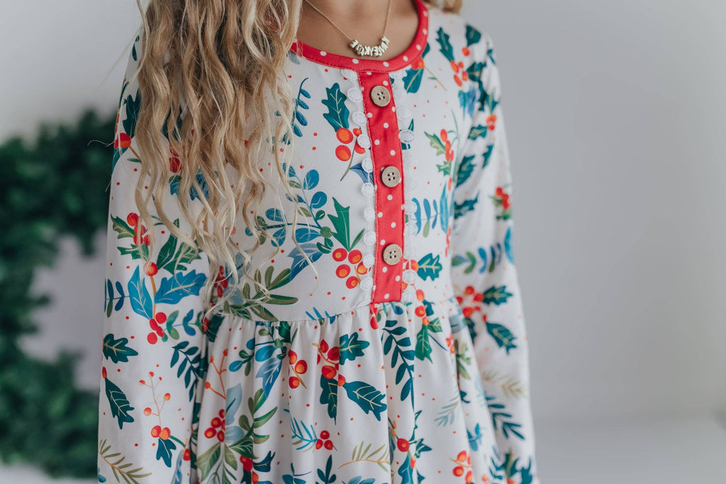Get your little fashionista ready for any occasion with our Holly Tie Dress. This playful dress features a trendy Christmas Holiday Holly print. The polka dot ruffles and tie design are sure to make a statement. Pockets, buttons, and lace accents add to the festivity. Perfect for girls who love to stand out and have fun with their style. 95% Polyester, 5% Spandex