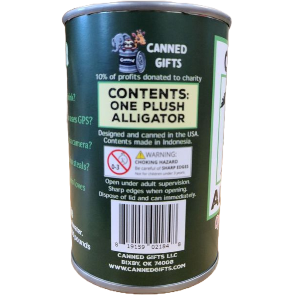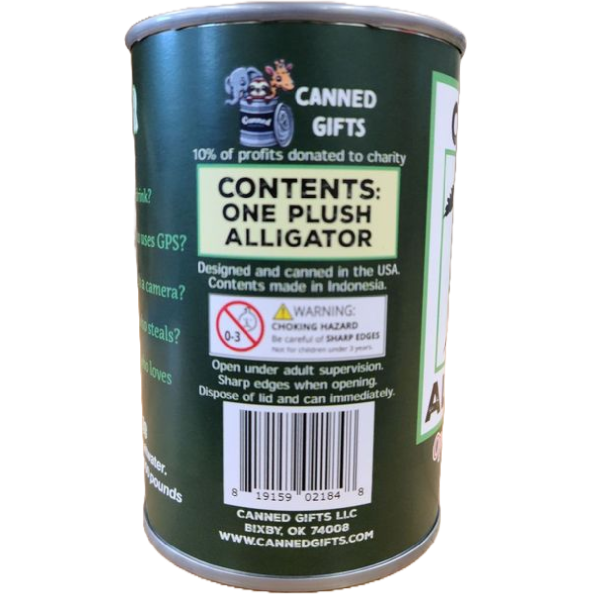 About this can: Meet Rex the Canned Alligator Included is 1 plush alligator sealed in a can. Use a can opener to open the fun gift or choose a pop top lid Alligator measures approx. 8 inches in length Funny gator jokes and an interesting fact on the can Designed and canned in the USA. Can and label made in USA. Plush made in China. 100% recyclable packaging Our cans are loved by all, children and adults alike. Few people can say they've received a Canned Alligator before! People also consider: zoo collection gift shop museum flower shop boutique fun unique present gifts stuffed animals gifts kids toys teacher appreciation gifts reptile wish pets birthday Louisiana Florida alligators gators Coastal gifts small gifts toysmith kids toys stocking stuffers teacher gifts Christmas gifts faire plush Texas Louisiana plush animals toys stuffed animals unique gifts gift shop items swamp marsh marshes swamps